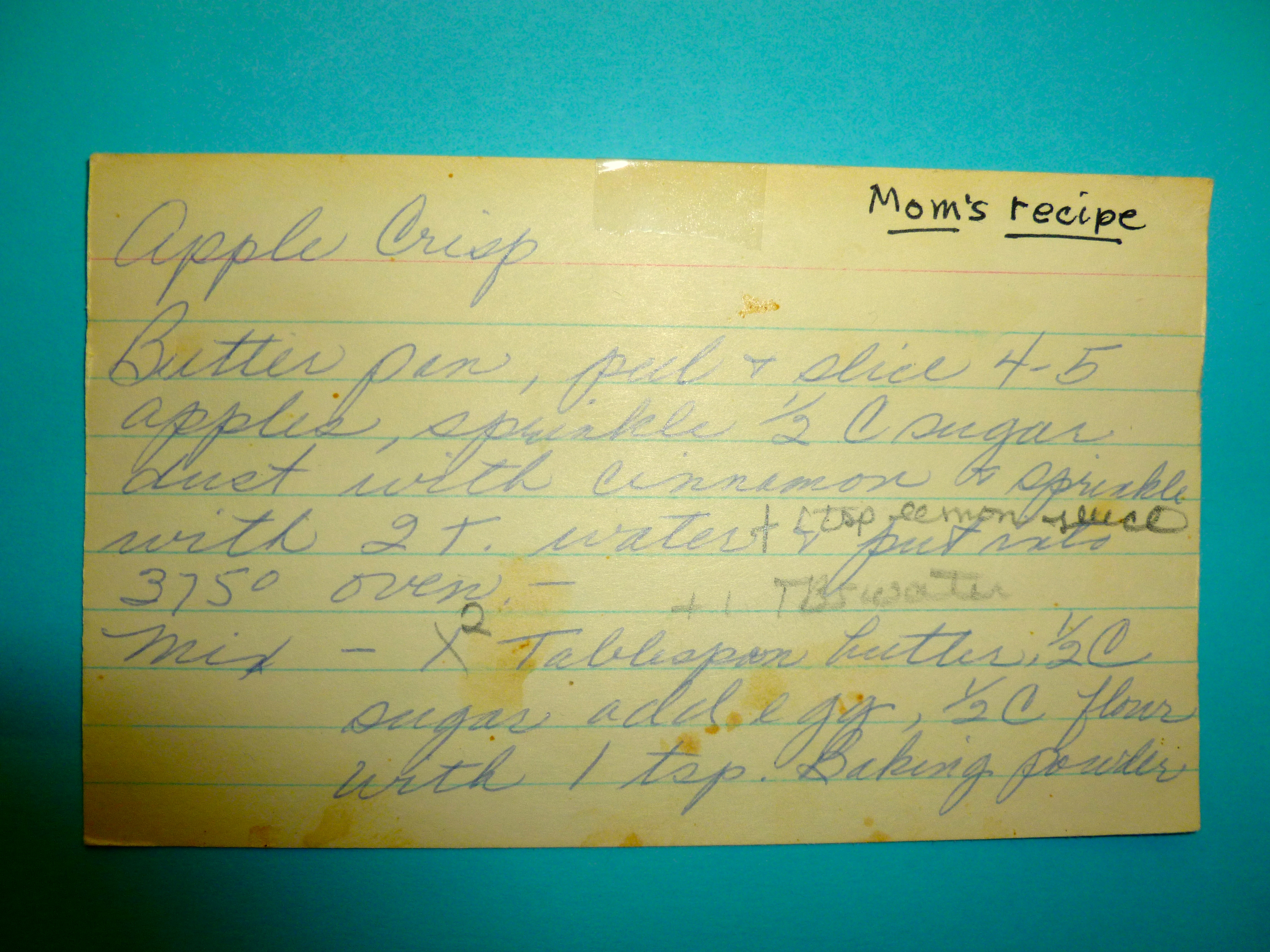 Last Christmas, my sister found two copies of the apple crisp recipe written in my mother’s handwriting. I baked it for Christmas dinner when my son and daughter-in-law visited. My daughter-in-law asked for a copy of the recipe. I started to copy it when I realized that mom’s recipe was written with the presumption that the reader was an experienced baker, or at least had someone like my mom to stand-by and help. Some of the amounts of various ingredients were vague, and some of the steps I knew were left out of the written recipe.